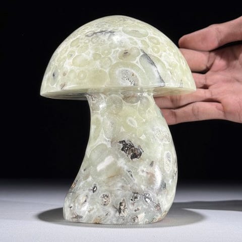 Tämä upea sieni-veistos, joka on veistetty yhdestä Turritella-kivestä, on todistus käsityötaidosta ja luonnon kauneudesta. Sen orgaaninen muoto korostaa kivessä luonnostaan esiintyviä monimutkaisia kuvioita ja värejä, tehden siitä ainutlaatuisen teoksen.