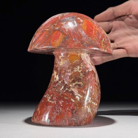 Täydellinen keräilijöille ja luonnon taiteen harrastajille, tämä veistos vangitsee sienten leikkisän viehätyksen, jotka usein liittyvät taianomaisiin metsiin ja kansantarinoihin. Kiillotettu viimeistely korostaa kiven luonnollisia sävyjä, luoden kiehtovan koriste-esineen kotiisi tai toimistoosi.