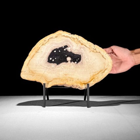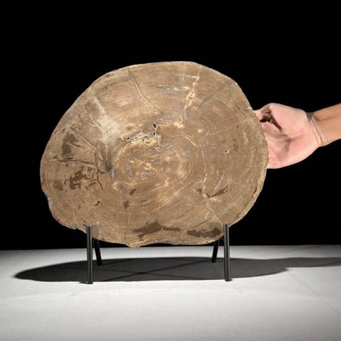 Upea kivettyneen puun viipale räätälöidyllä jalustalla.
