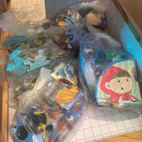 Pitäisi olla kaikki palat kaikissa tallessa, osassa kansi on vähän kärsinyt.