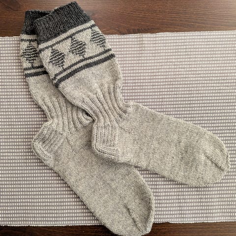 7 veljestä langasta käsin neulotut jussikuviolliset sukat, koko 44-45. Harmaat sinisellä kuviolla. Saatavilla 2 samanlaiset.