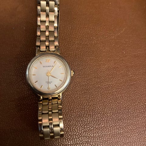 Leijona titanium naisten rannekello, jossa on valkoinen kellotaulu ja musta nahkaranneke sekä titaaninen kuori. Kellossa on selkeät numerot ja perinteinen design, sopiva arkikäyttöön. Kellossa uusi paristo. Kello pesty ja desinfioitu.
