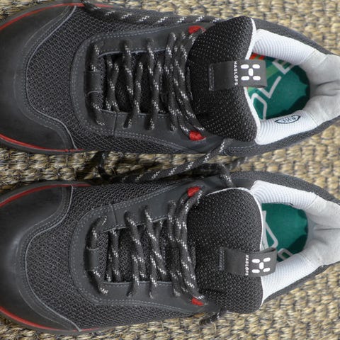 Harmaat ulkoilukengät, leveä lesti. Muuten hyvässä kunnossa, mutta kärjissä kumiosassa halkeamia, ovat pitäneet kuitenkin hyvin kosteutta.