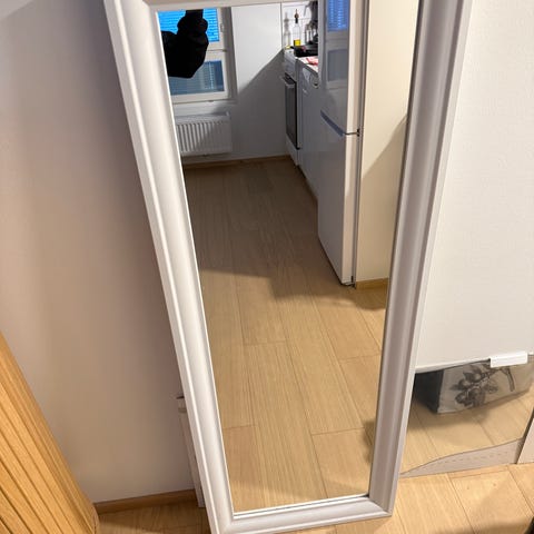 IKEA Toftbyn peili mustalla kehyksellä. Voidaan ripustaa seinälle pystyyn tai vaakaan. Sijaitsee Vallilassa.
