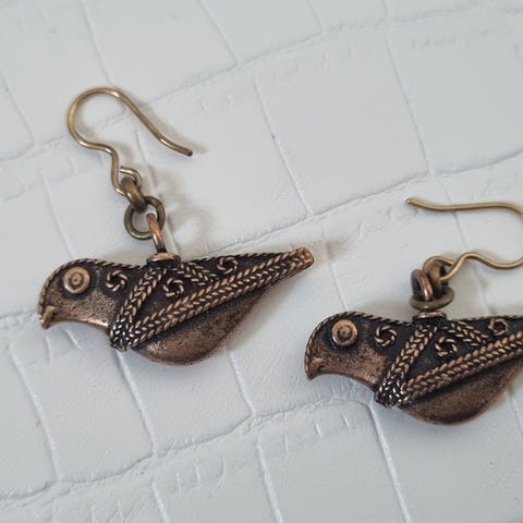 Kalevala Korun pienempi Hattulan lintu rintakoru 90-luvulta. Pronssia, leveys 34mm. Kalevala korun sivuilla lisätietoja vastaavasta: https://www.kalevala.fi/products/pidetty-hattulan-lintu-rintakoru-pieni-pronssi