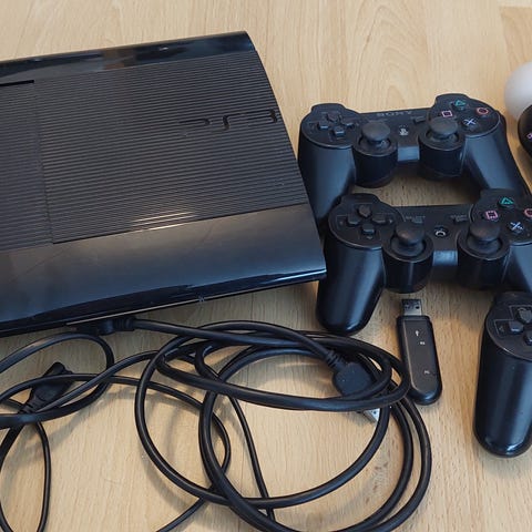 PlayStation 3 (PS3) -pelikonsoli ja siihen liittyviä pelejä sekä ohjain.
