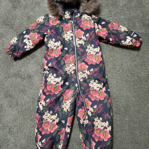 Vihreä Name it-toppahaalari. Koko 104. Silikoniset jalkalenkit. Irroitettava vaalea karva hupussa. Vasemmalla puolella rinnan kohdalla pieni nirhauma.