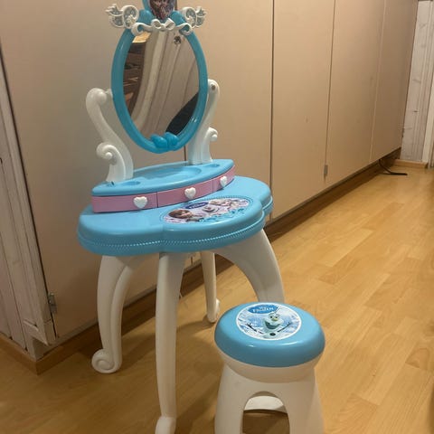 Disney Frozen lasten meikkipöytä sinivalkoisella värityksellä. Sisältää peilin ja säilytyslokeroita. Soveltuu lasten käyttöön. Koiratalous.