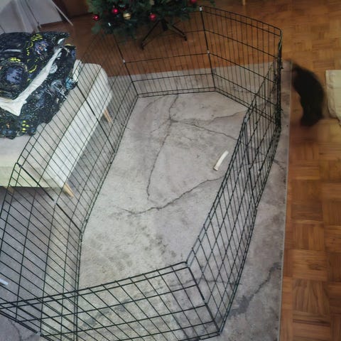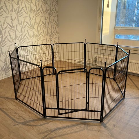 Käytetty pentuaitaus. Saa erilaisiin muotoihin ja kasaan näppärästi. Yksi kiinnike korvattu nippusiteellä.