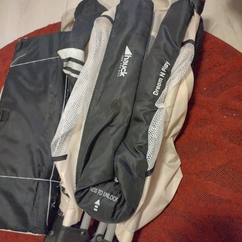 Kokoontaittuvaa matkasänky säilytyspusseineen.