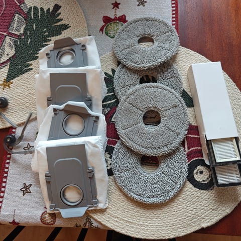 Myydään Roborock Saros 10 tarvikesetti sisältäen monta pölypussia, moppia ja kaikki robotti-imurin vaihdettavat/kuluvat osat.