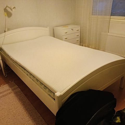 Junet merkkinen massiivipuuta oleva parisänky. Mukana tulee 2kpl yöpöytiä. Hyvässä kunnossa oleva sänky ja vikassa kuvassa näkyy pieniä kissan raapimia naarmuja. Yöpöydät ovat erittäin hyvässä kunnossa ja ne pystyy laittamaan lukkoon avaimella. Leveys sängylle on 160cm. Mukana ei tule patjaa, mutta petauspatjan voi halutessaan saada.