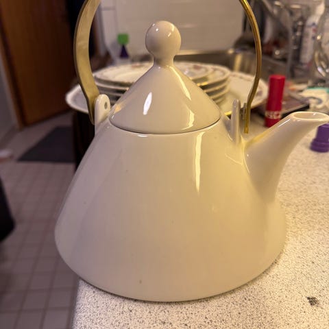 Arabia Harlekin posliininen teekannu. Saattaa olla joku erikoiserä. Lahjaksi saatu joskus 90- luvulla joten en ole varma. Ei oikeastaan kertaakaan käytetty.