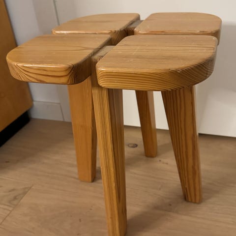 Apila -jakkara, valmistajalta Keravan puusepäntehdas. Jakkarassa on alkuperäinen tummanvihreä väri. Jakkara on vanha ja siinä on ajan patinaa.
