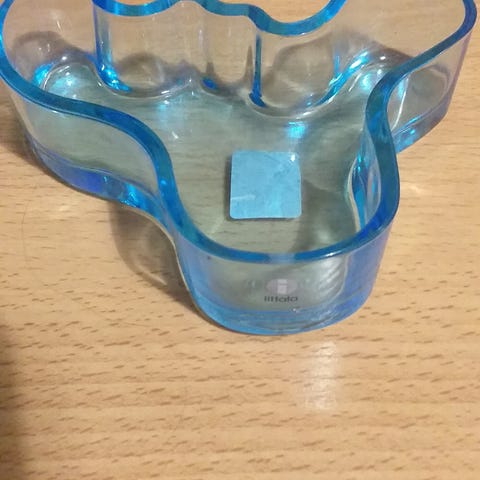 Pieni valkoinen Aalto-maljakko. Korkeus 95 mm (vajaa 10 cm). Yhdessä reunassa pienen pieni särö, näkyy kuvassa.