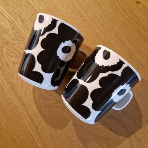 Myydään 2 x 2,5 dl mukeja sekä 2 kpl 20cm lautasia. Hinta yht. 65€.