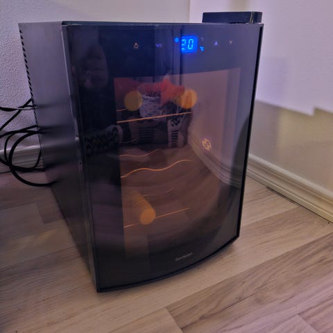 Pieni, kompakti juoma/viinikaappi Led valolla. Tilavuus 21 l / 8 normaalikokoista viinipulloa. Lämpötilan säätö 8-18 °C, Energialuokka:A+