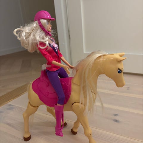 Pehmolelu hevonen, vaaleanruskea, pehmeä materiaali. Käytetty mm. barbien hevosena. Valjaat itse tehdyt.
