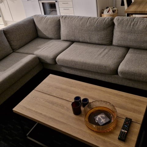 Askon laadukas kulmasohva tiheäkutoisella kankaalla, sohvaan kuuluu myös rahi. Sohva sopii olohuoneeseen ja tarjoaa istumatilaa useammalle henkilölle. Kangasmateriaali on helppohoitoinen ja väri neutraali, soveltuu monenlaiseen sisustukseen. Siisti ja vain muutaman vuoden vanha.