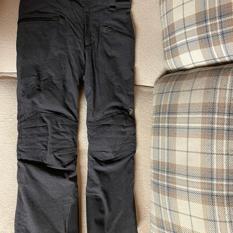 Lähes uudenveroiset topatut Peak Performance -housut lasketteluun tai lautailuun. Tumman harmaat. Taskuissa vetoketjut. Lahkeissa lumilukot. Vyötärö säädettävä.