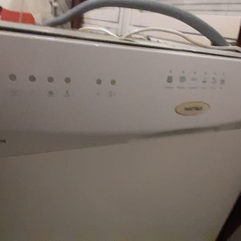 AEG astianpesukone, joka on täysin toimiva, mutta kuten kuvasta näkyy, etupaneelin kahva on hajalla. Koneen saa kuitenkin avattua ilman kahvaa, lapsille avaaminen haastavaa.