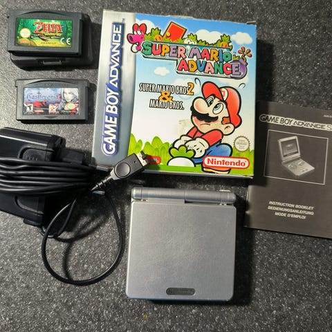 Myydään kuvien mukaisessa hyvässä kunnossa oleva Game Boy Advance SP "Surf Blue" konsoli pakkauksineen ja sisältöineen. Akku vaihdettu tänään (2.1.2026) ja pelattu yksi kisa Mario Kartia.