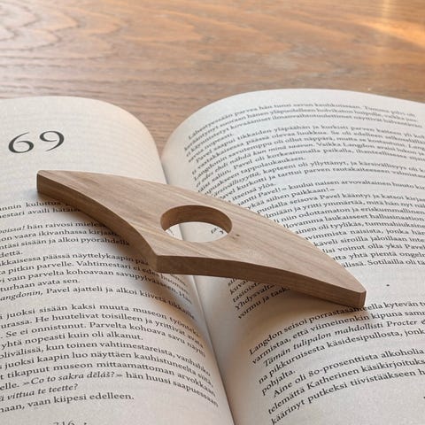 Kirjatyynyn voi muotoilla kirjan koon, alustan ja lukijan tarpeiden mukaan. Se myötäilee alustaa ja tukee kirjaasi, joten voit lukea niin pitkään kuin haluat. Siksi voit käyttää sitä istuen pöydän ääressä, seisoen keittiötason äärellä tai maaten sängyssä.