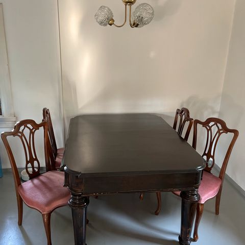 Tummaksipetsattu koivupöytä ja neljä tuolia, joissa keskellä keinonahkainen pehmuste. Pöydän halkaisija 100 cm