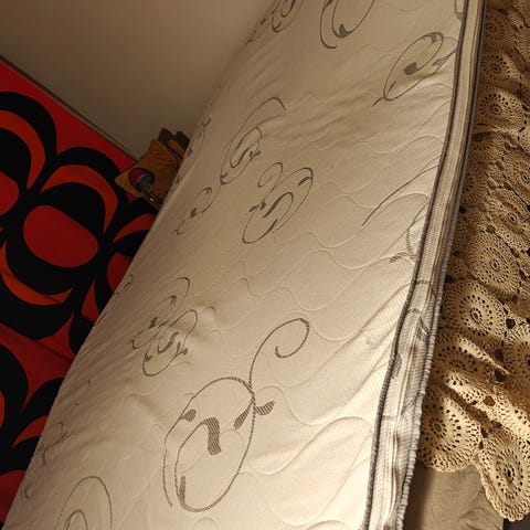 Annetaan kaksi ok kuntoista joustinpatjaa. Yhdessä patjassa pieni reikä kankaassa, mikä näkyy kuvassa. Ei haittaa käyttöä. Kissan, koiran ja pupun karvoja saattaa tulla mukana, imuroin kuitenkin ennen noutoa.
