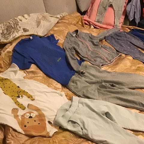 Lasten vaatteet kokoa 122-134. Jotkut vaatteet ovat paremmassa kunnossa ja jostain löytyy tahroja. Kuvassa näkyvä pino tulee mukana, koska niissä paljon tahroja ja parissa pienet reiät, mutta ei vaikuta käyttöö. :)
