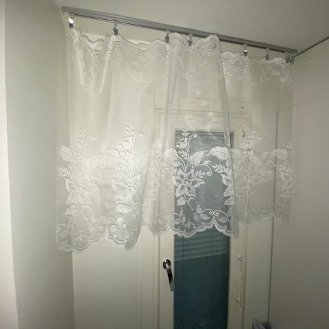 Korkeus 43 cm, leveys 250 cm. Yläreunassa ripustusreiät. Voi kiinnittää myös nipsuilla. Pesu 30 asteessa, ei tarvitse silittää.