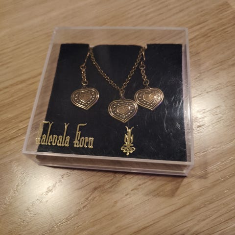 Kalevala korusetti, joka sisältää kaulakorun ja korvakorut. Valmistettu hopeasta, suunniteltu naisille. Korusetin design sisältää pyörremäisiä koriste-elementtejä. Kaulakorun pituus 44 cm. Setti voidaan myydä erillään, tällöin kaulakorun hinta 120 euroa, riippukorvikset 35 euroa ja nappikorvikset 30 euroa. Koko setin hinta 160 euroa.