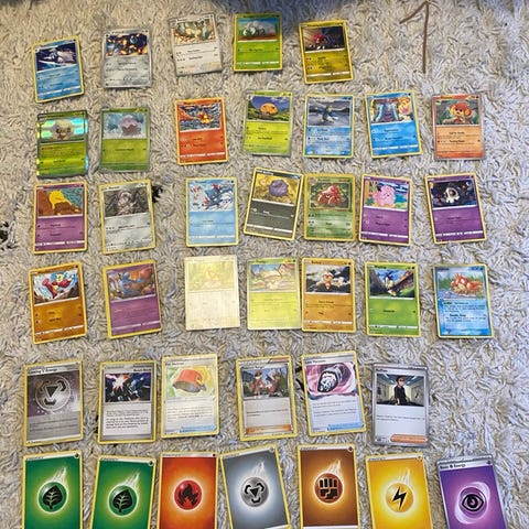 Pokemon kortteja 39 kpl ja pieni laatikko niille. Yli 100HP korteista erilliset kuvat, lisäksi 40-90HP kortteja, trainer ja tavarakortteja sekä energiakortteja.