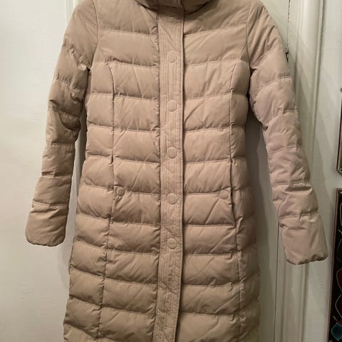 Armani Collezioni pitkä takki, outo koko 52. Takki on beigen värinen, 100 % polyesteri. Tosi lämmin. Itselleni liian iso. Käytän M kokoa, tämä vastaa tilavaa L kokoa.