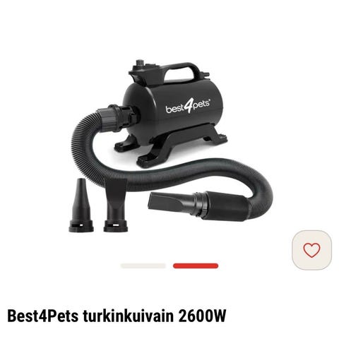 Tehokas Best4Pets turkinkuivain lemmikkien turkkien kuivaamiseen. Kannettava ja kompakti kuivain soveltuu niin kotikäyttöön kuin näyttelyihinkin. Kevyessä ja tyylikkäässä kuivaimessa on 2-portainen puhallinnopeuden säätö, jolla on helppo mukauttaa puhallustehoa kuivattavan kohteen mukaan. Turkin hoitamista ja kuivaamista helpottaa laitteen mukana tulevat kolme erilaista, helposti vaihdettavaa ja pestävää suutinta.