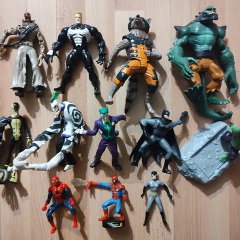 Joukko figuureja. Yhdeksän samankokoista, Black Panther pienempi, ja kaksi pienempää figuuria(Venom, ja joku itselle tuntematon). Ironman, Captain America ja Spiderman kuluneempia ja enemmän leikittyjä. Kaikki kuitenkin siistejä. Toinen Batman kaipaa pattereiden vaihdon, ja on toimiva. Allergiakoti. Nouto.