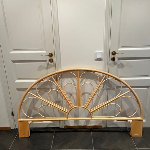 Rottinkinen sängynpääty 120cm leveään sänkyyn, korkeus päässä 73cm ja keskellä 78cm, saa ruuveilla sängyn runkoon kiinnitettyä. Koristeköynnöksen saa halutessaan mukaan