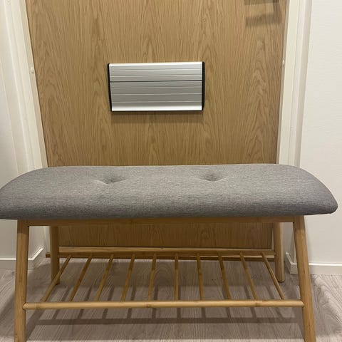 Hyväkuntoinen käytetty penkki / kenkähylly on kätevä kaluste eteiseen. Pehmustetulla istuimella on mukava pukea kengät ja sen alapuolella on säilytystilaa kauden käytetyimmille kengille.