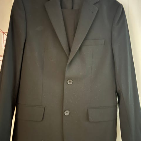 Aros-merkkinen suomalainen valmiste, hyvä rypistymätön materiaali, kaksirivinen napitus, puvussa ei ole kokomerkintää, vertailtu pukuun, jonka koko on 48.