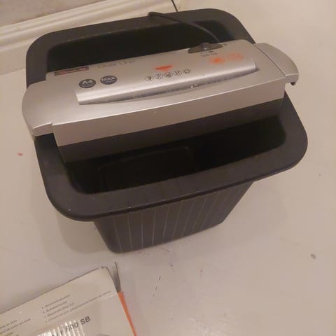 Kuvan mukainen paperisilppuri. Monta vuotta sitten ostettu, jäänyt käyttämättömänä kaapissa, ja nyt olen avannut ja tarkistanut yhden paperin avulla ja se toimi.