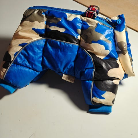 Siistissä kunnossa oleva ohut koiran toppaloimi, selän pituus noin 60cm. Haku Lempyy, Suonenjoki