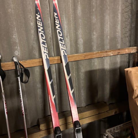 Sukset jo hieman kuluneet, sauvoja käytetty vain muutaman kerran, hyväkuntoiset monot