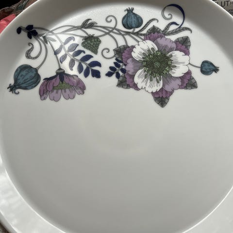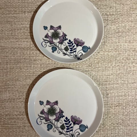 Vallilan Linnea-kuosiset ruokalautaset x4, (halkaisija n 26 cm) ja leipälautaset x4 (halkaisija n. 21 cm).