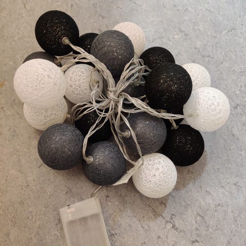 Kuvanmukainen pallovalosarja. Toimii paristoilla. 20 palloa.