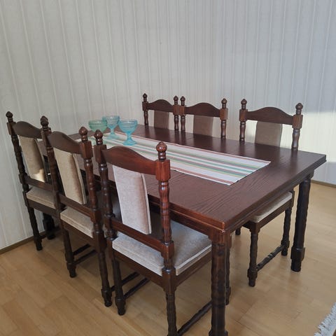 Jalopuinen tyylihuonekaluryhmä, hyvin säilynyt, kuudelle hengelle, mutta jatkettaessa pöytälevyä mahtuu hyvin 8.