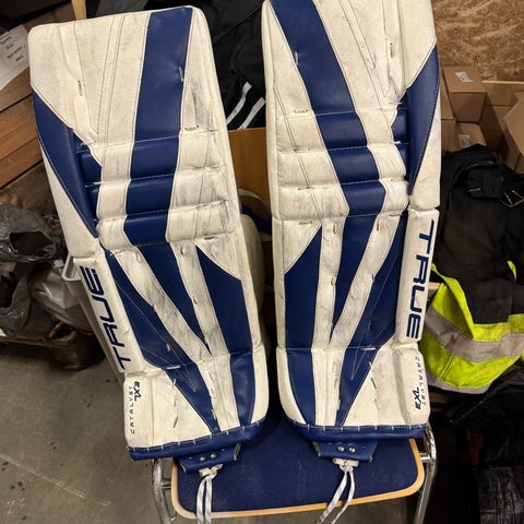 Warrior Jääkiekko maalivahdin suojat valkoisella värillä. Suojat on suunniteltu jääkiekon maalivahdin käyttöön ja ne tarjoavat suojaa ja liikkuvuutta pelitilanteissa.