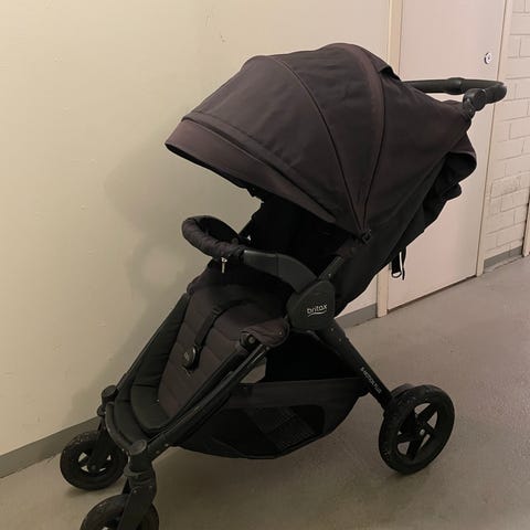 Britax B-motion plus mustat lastenrattaat. Rattaissa on säädettävä työntöaisa ja kuomu. Rakenne sisältää istuinosan, jossa on turvavyöt.