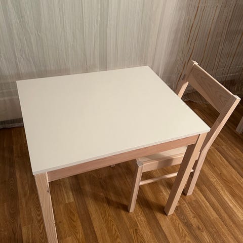 Ehyt ruokailuryhmä jossa on kaksi tuolia ja pöytä
