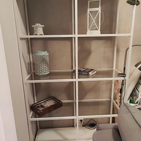 Ikean hylly, tuunattu dc-fixillä ja maalattu, mutta maali jo kulunut.