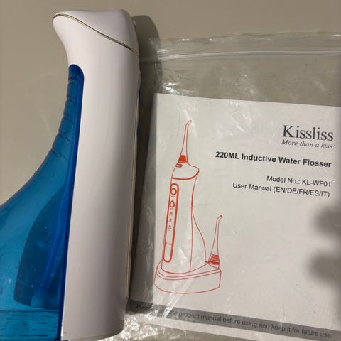 Mukana kaksi vaihtopää toinen pussissa ja toinen ollut testauksessa jonka jälkeen desinfioitu, latausjohto, ohjekirja.